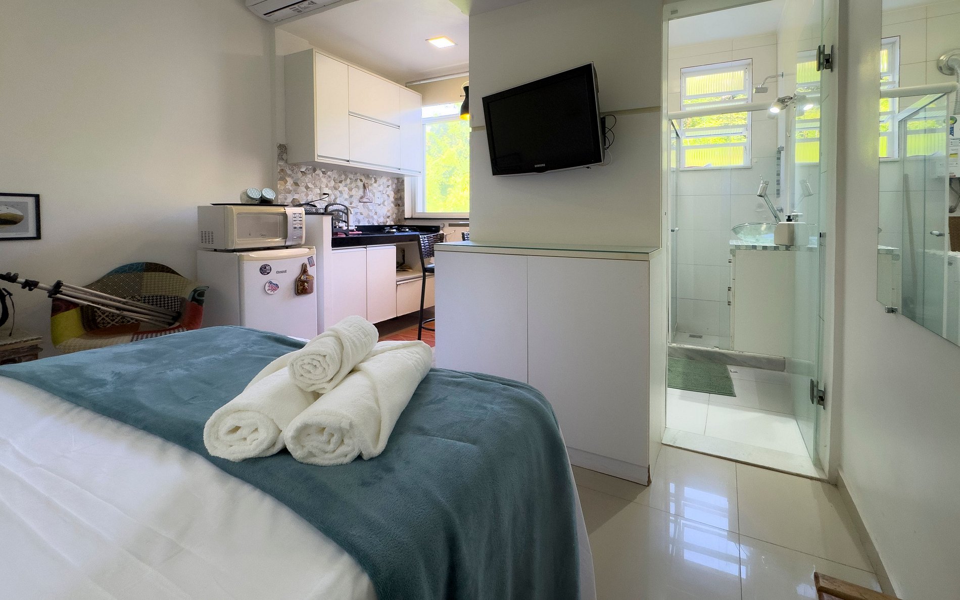 Si necesita conciliar descanso y trabajo, ofrecemos wifi de alta velocidad y una barra que sirve como estación de trabajo cómoda. Para los días calurosos de Río, el aire acondicionado split y el ventilador de techo aseguran el clima ideal. El edificio es seguro, con conserje hasta las 24h y con monitoreo y portero electrónico durante la noche.