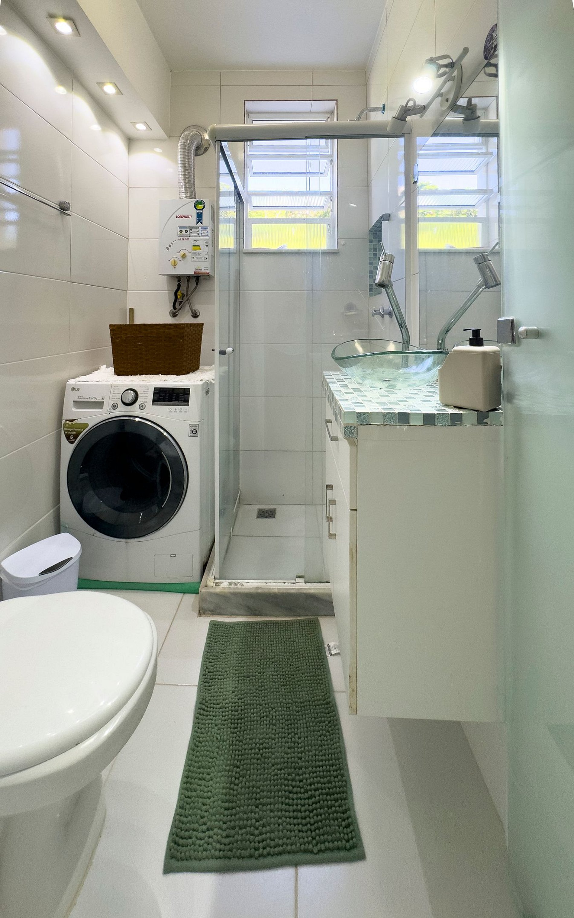 El diseño está optimizado para su comodidad. La carpintería inteligente divide el ambiente: de un lado, una cama acogedora y nichos iluminados para su lectura nocturna; del otro, una cocina compacta y funcional. El destaque es la barra de comidas estratégicamente ubicada junto a la ventana, permitiéndole disfrutar su desayuno observando el bosque. El baño es privado y cuenta con lavadora—a diferencia rara y práctica para estadías de cualquier duración. El espacio acomoda perfectamente hasta dos personas y es adecuado para familias (bebés son bienvenidos).